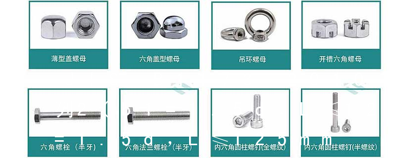 例如,效能等級4.6級的螺栓,其含義是:1、螺栓材質公稱抗拉強度達400MPa級;2、螺栓材質的屈強比值為0.6;3、螺栓材質的公稱屈服強度達400×0.6=240MPa級效能等級10.9級高強度螺栓,其材料經過熱處理后,能達到:1、螺栓材質公稱抗拉強度達10 產品系列 產品詳細分類 六角螺栓 (1)外六角全牙:GB5783/DIN933 (2)外六角半牙;GB5782/DIN931(3)B級法蘭面六角螺栓:GB5787(4)活節螺栓:GB798/DIN444 (5)手工焊用焊接螺栓:GB902 方頸螺栓 (